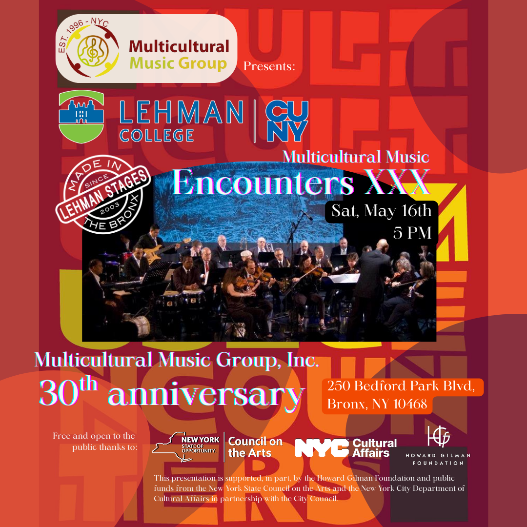 Multicultural Music Encounters XXX Saturday, May 16, 2026 5:00 PM 6:00 PM Lehman College 250 Bedford Park Boulevard West The Bronx, NY, 10468 United States (map) Google Calendar ICS
